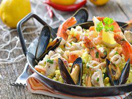 Garnelen, Calamariringe und den Fisch in die Pfanne legen und eine Minute stark anbraten. Herausnehmen, die weißen Zweibelwürfel, Schinkenwürfel, Knoblauch und Paprika hineingeben und 5 min braten, Tomaten und Cayennepfeffer dazu geben und würzen.